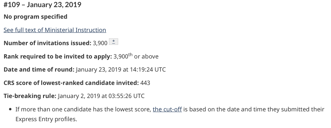 2019年1月23日第109轮联邦快速移民通道E/E最新抽签结果出炉。提档分443分,共有3900人获得邀请。相较上次(1月9日的108轮)的提档分449分大幅微降,获邀人数3900人不变。